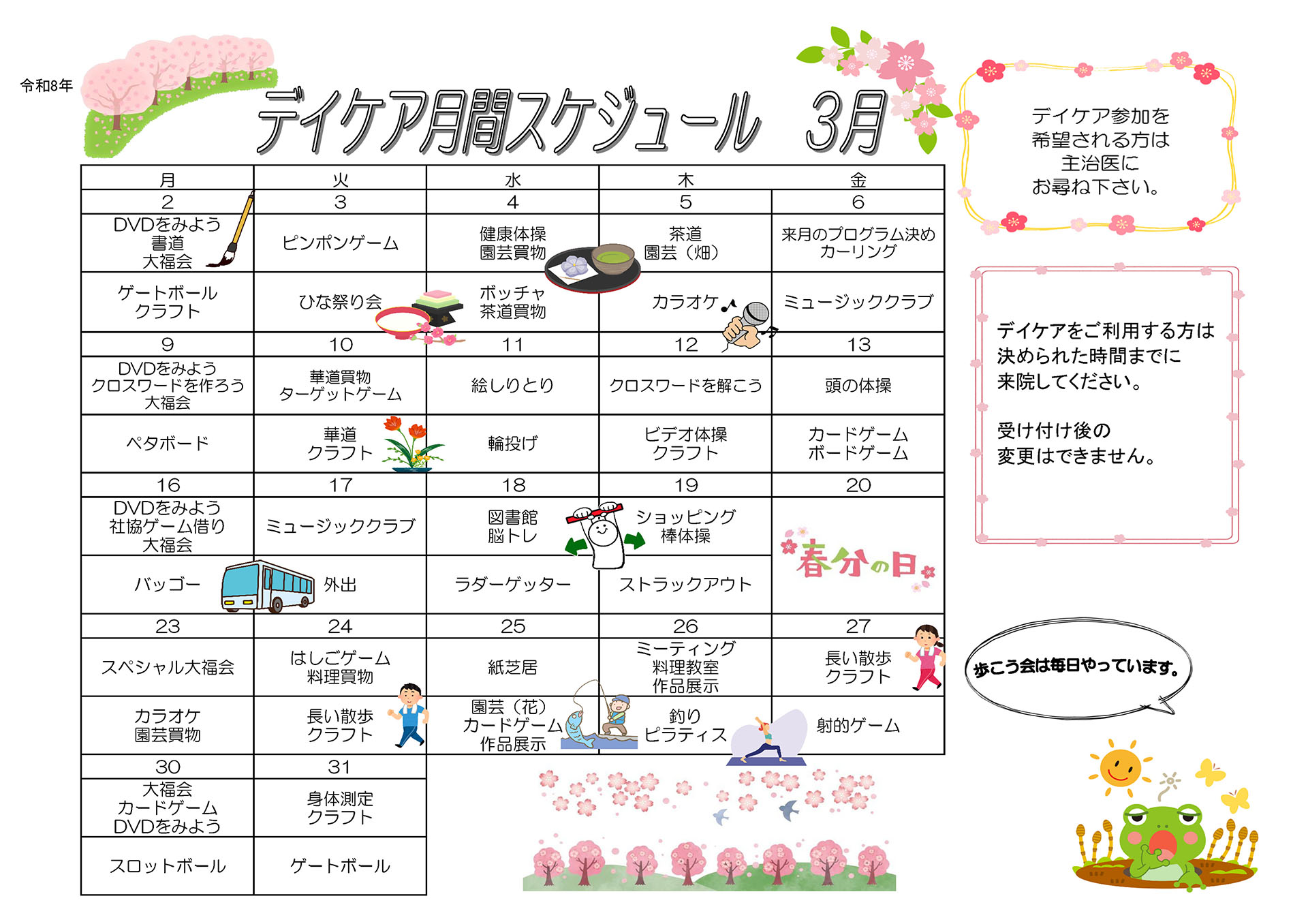 デイケア月間スケジュール2026年3月 2026.03.01 2026.03.02 精神科デイケア 精神科デイケア、2026年2月の月間スケジュールです。 記事のタイトルとURLをコピーする デイケア月間スケジュール2026年2月 前の記事